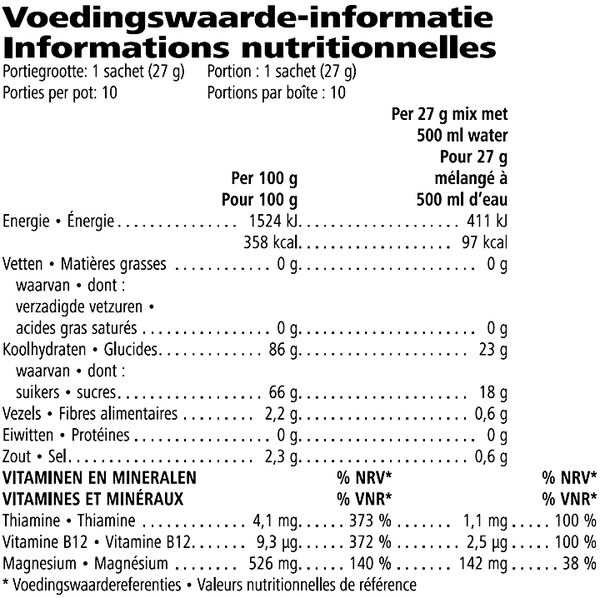 Secouez délicatement la boîte avant chaque utilisation car le contenu peut devenir compact. Mélangez 27 g (2 mesures) de poudre avec 500 ml d’eau, secouez vigoureusement. A consommer de préférence pendant l'exercice.